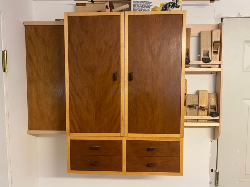 In the interest of creating a home for some Japanese kannas that protects them from fluctuations in humidity, I decided to build a small cabinet to fit about 6 kannas for finish planing in the space between the bigger hanging tool chest and a side wall. To tie in the design with the larger cabinet, I used leftover veneer of flame “white” mahogany for the door. The big tool cabinet was one of the first pieces I made (ca 2004) where the “white” mahogany was on sale at MacBeath’s hardwoods.