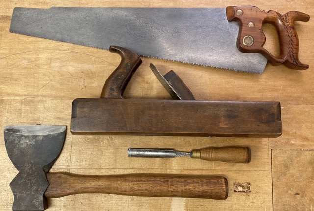 Four common hand tools used for working wood from top to bottom: a hand saw produced by Simonds Saw Co. around 1920, a hand plane produced by W. Butcher around 1820, a chisel produced by Buck Brothers around 1880, and a True Temper TB2 side axe produced after 1949.
