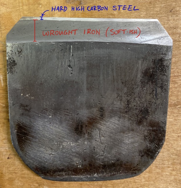 Both pre-industrial western and Japanese plane blades were a laminated construction that required hand crafting by a blacksmith. This laminated construction marries two different types of steel to take advantage of their strengths and compensate for weaknesses. In particular, the cutting edge consists of a high carbon steel layer married to a body of more malleable low carbon steel, like wrought iron. The high carbon steel layer can be hardened to take a very sharp edge but can become brittle and difficult to sharpen in the process. The malleable low carbon body of the blade reduces the fragility of the edge by providing support and reducing the amount of high carbon steel that needs to be removed to resharpen the blade.