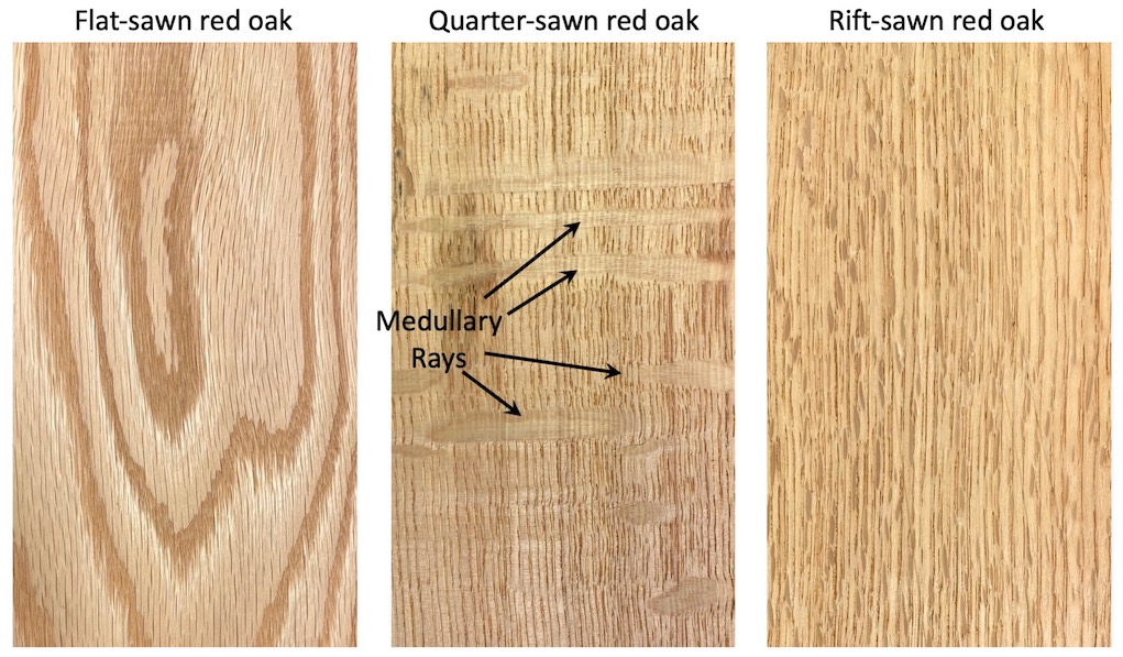 A formal event calls for the elegance of a black dress or well-tailored black suit. The point of clothing made from black fabric is that it doesn’t have the distraction of a pattern or varying color pallet. In composing your outfit, a fine necklace or tie can provide a singular focal point. In creating a piece of furniture out of wood, like clothes, there are elements to the design beyond function. Similar to fabric, wood as a natural material has texture, patterns and color. Yet unlike fabrics, nature has limited the design options. In designing a wooden object, the craftsperson is limited largely to selecting the type of wood and how the board was cut out of the tree to select the texture and patterns. For instance, red oak has pronounced pore structure that can give rise to v-shaped or cathedral-shaped patterns when cut tangentially to the central axis of the tree (called flat-sawn). When cut radially to the tree (called quarter-sawn), these pores become vertical lines – like pin-striping – interspersed with wavy flake patterns created by the medullary rays in the tree. When cut In between these two extremes (called rift-sawn), the vertical lines remain. These three grain patterns are depicted in the image below.