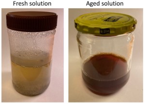 As the solution aged over the next weeks, it changed in color from clear to orange tinted (as seen in the picture above) and an orange-brown precipitate formed on the walls and bottom of the container. While I didn’t analyze the chemical composition, I’d surmise that the initial solution contained primarily ferrous (Fe2+) acetate, which is highly soluble in water. In contrast, the aged solution likely contains primarily iron (ferric Fe3+) acetate, which is insoluble in water.