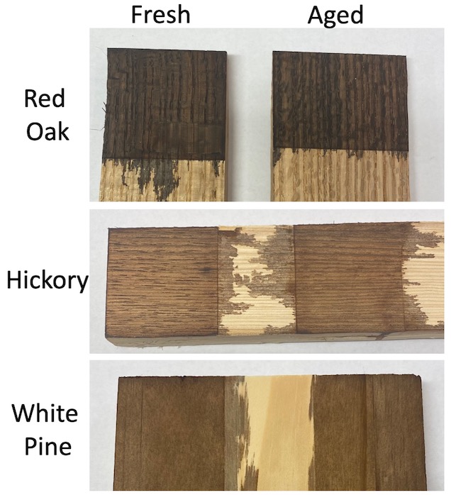 As expected, woods with the highest tannin content gave the best results. While initially the color was matte gray, a wash with a 50:50 mixture of tung oil and mineral spirits imparted a richness to the color. Red oak became the darkest, almost black with some variation with the grain. Hickory, which has a much lower tannin content than oak, took on a brown hue. With the lowest tannin content of the three woods, white pine also took on a brown color with gray overtones. White pine also absorbed the most solution, which makes it appear almost darker than the hickory.