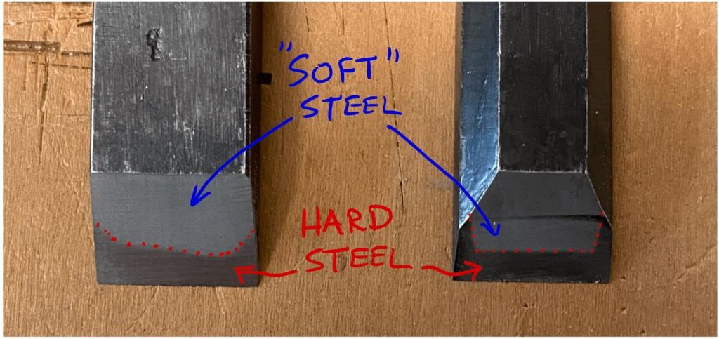 Industrial processes improve consistency associated with a product by decoupling the quality of the product from the skill of the “maker”. In both the west and Japan, pre-industrial woodworking blades, which include both hand planes and chisels, used forged blades, where a brittle high carbon steel cutting edge was laminated to a resilient low carbon backing steel. The grafting of a thin high carbon edge steel onto a low carbon backing steel enables the tool to be honed to an extremely sharp edge while being resistant to chipping and easy to sharpen. The manual labor required during the forging process doesn’t translate well to industrial processes. As a result, plane blades and chisels made by industrial processes are made entirely from the same steel that has averaged material properties compared to the forged blade.