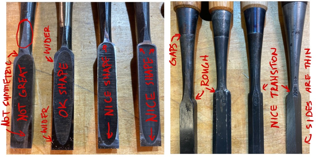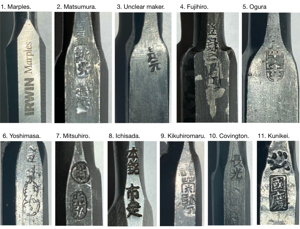 Japanese chisels are largely hand-made by a blacksmith. In contrast to products made by industrial processes, hand-crafting introduces more variability into the finished products. While that variability may be not noticeable by the end user, a small random sample, which here is a sample size of 1, may not be entirely representative of a particular brand. In addition, a particular chisel brand may subcontract out to different blacksmiths to make their product or the skill of the blacksmith can improve with experience and can diminish in old age. Collectively these factors can lead to variability in the quality of a brand over time. Given those caveats, the results presented here are more to illustrate a process for evaluating/selecting chisels rather than absolute recommendations for particular brands. There are so many other blacksmiths from contemporary and bygone times that produced excellent chisels that we haven’t tried.