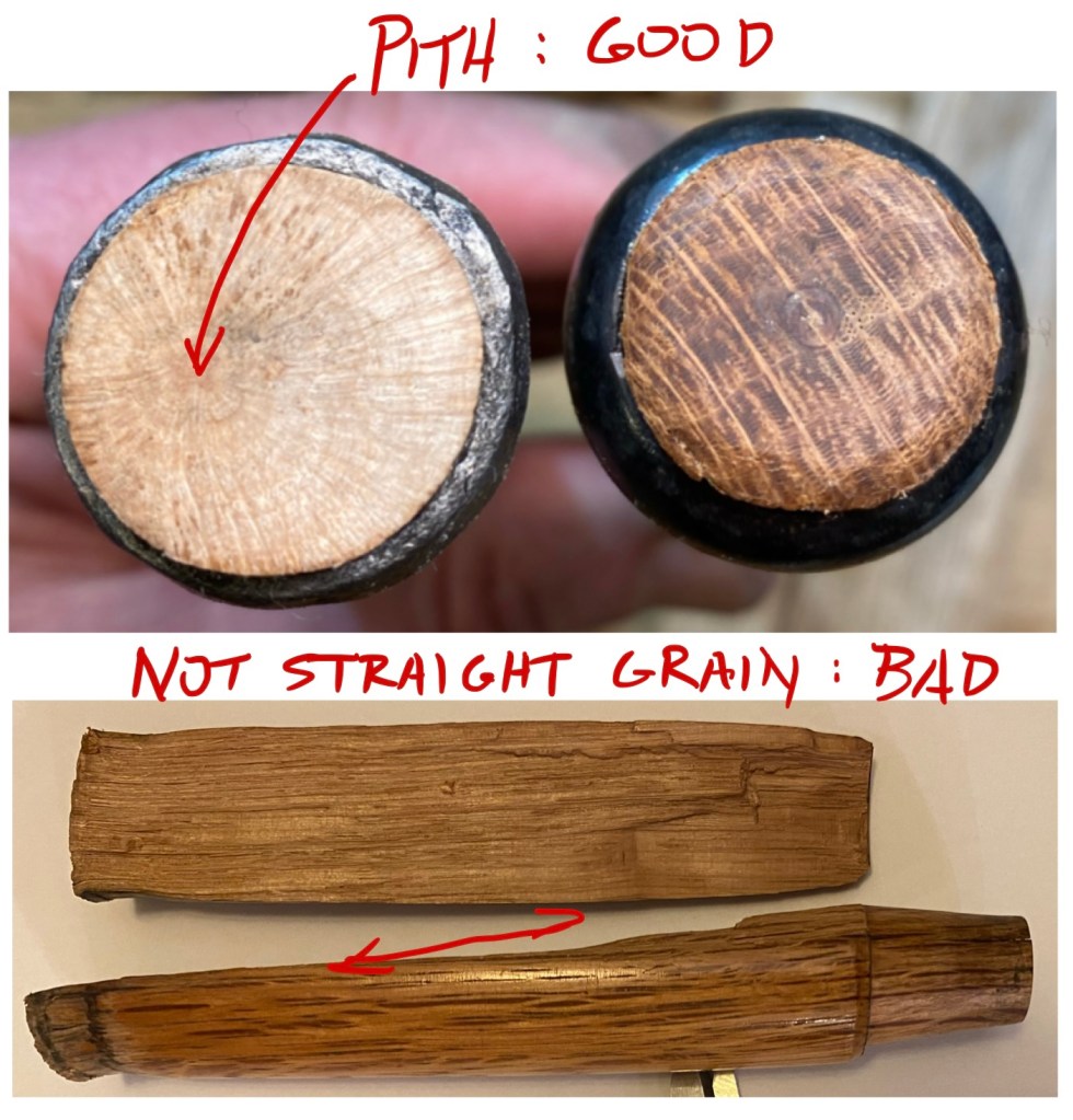 Human interaction with the chisel happens through the handle. Large handles like the Marples make the chisel unbalanced and almost unwieldy in use due to its top-heavy nature. Handles on the Japanese chisels were smaller and made the chisels well-balanced and easier to use. Differences in the handles of the Japanese chisels were more subtle. In some cases, the handles were made by a different craftsman and labeled with their trademark, which in this case was Kanei. Mastumura, Mitsuhiro, Kunikei, and Kikuhiromura brands all had Kanei branded handles. Apparently, branded handles can also vary in quality. The Mitsuhiro chisels have the ideal handle, which is from a branch with the pith in the center. Alternatively, the grain should be straight. Grain runout can lead to failure of the handle, which happened with a 18mm Matsumura chisel.