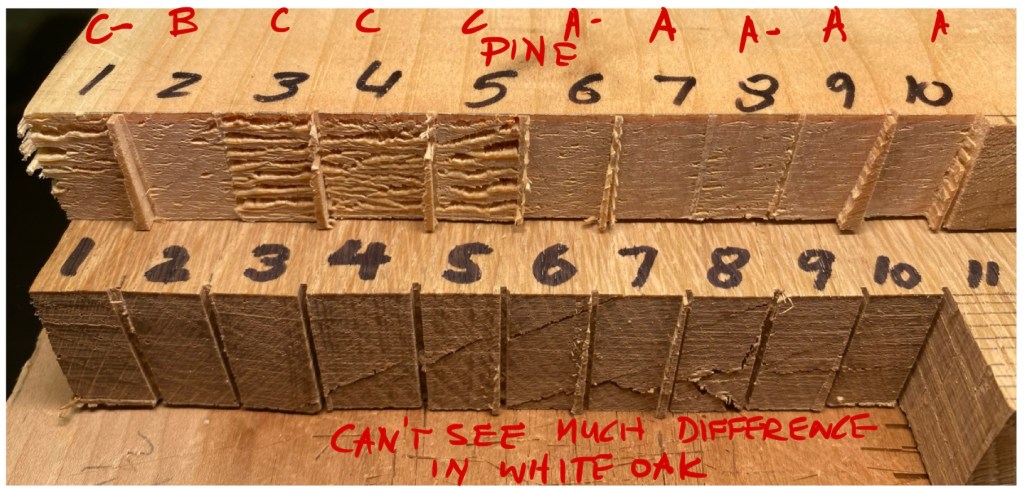 Chopping the end grain of white pine after the oak revealed key differences in the quality of the edge among the chisels. White pine is a much softer wood than oak and a sharp edge is required to cut the fibers. If the edge is not sharp, the wood becomes crushed before it cuts. We can see that the Marples chisel was the worst performing chisels in chopping pine as wider gaps can be seen indicating that more of the wood fibers were crushed before they were cut. The next performing group of chisels were Chisel #3, Fujihiro, and Oguro, which all three seemed to lose sharpness from chopping oak. Looking at the cutting edge, all three seemed to have slight chips at the leading cutting edge. The Matsumura chisel seemed to perform slightly better. Yoshimasa, Ishisada, Mitsuhiro, Kikuhiromaru, and Covington brands performed really well with the latter three seeming very slightly better.