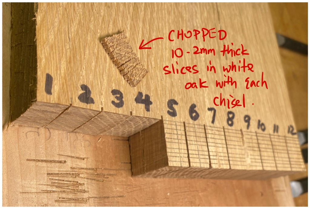 3. Chopped 10 x 2mm slices vertically through 1” thick kiln-dried white oak board using a 430 gram hammer as a driver. The edges of each slice were precut with a tenon saw to be the width of the chisel.